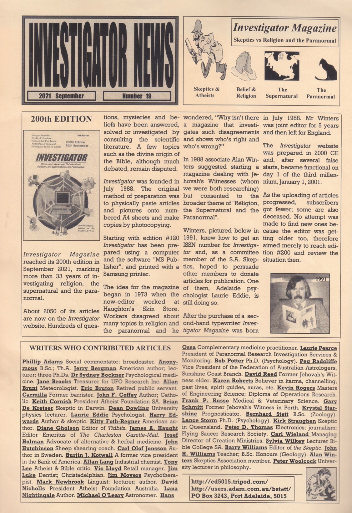 Below is the cover of Investigator #200 followed by Investigator News #19 published in #200: